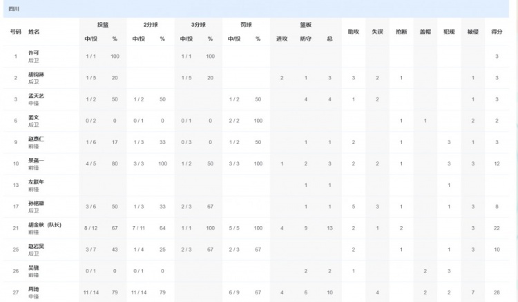 四川隊(duì)方面,周琦砍下28分10籃板2蓋帽,胡金秋貢獻(xiàn)22分13籃板2助攻2搶斷,孫銘徽得到8分1籃板5助攻1搶斷。