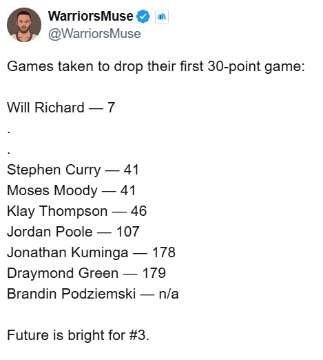 這也是他生涯第7場(chǎng)比賽,作為對(duì)比,庫(kù)里和穆迪都是在各自生涯的第41場(chǎng)比賽才拿到第一個(gè)30+;克萊是第46場(chǎng)、普爾則是第107場(chǎng);