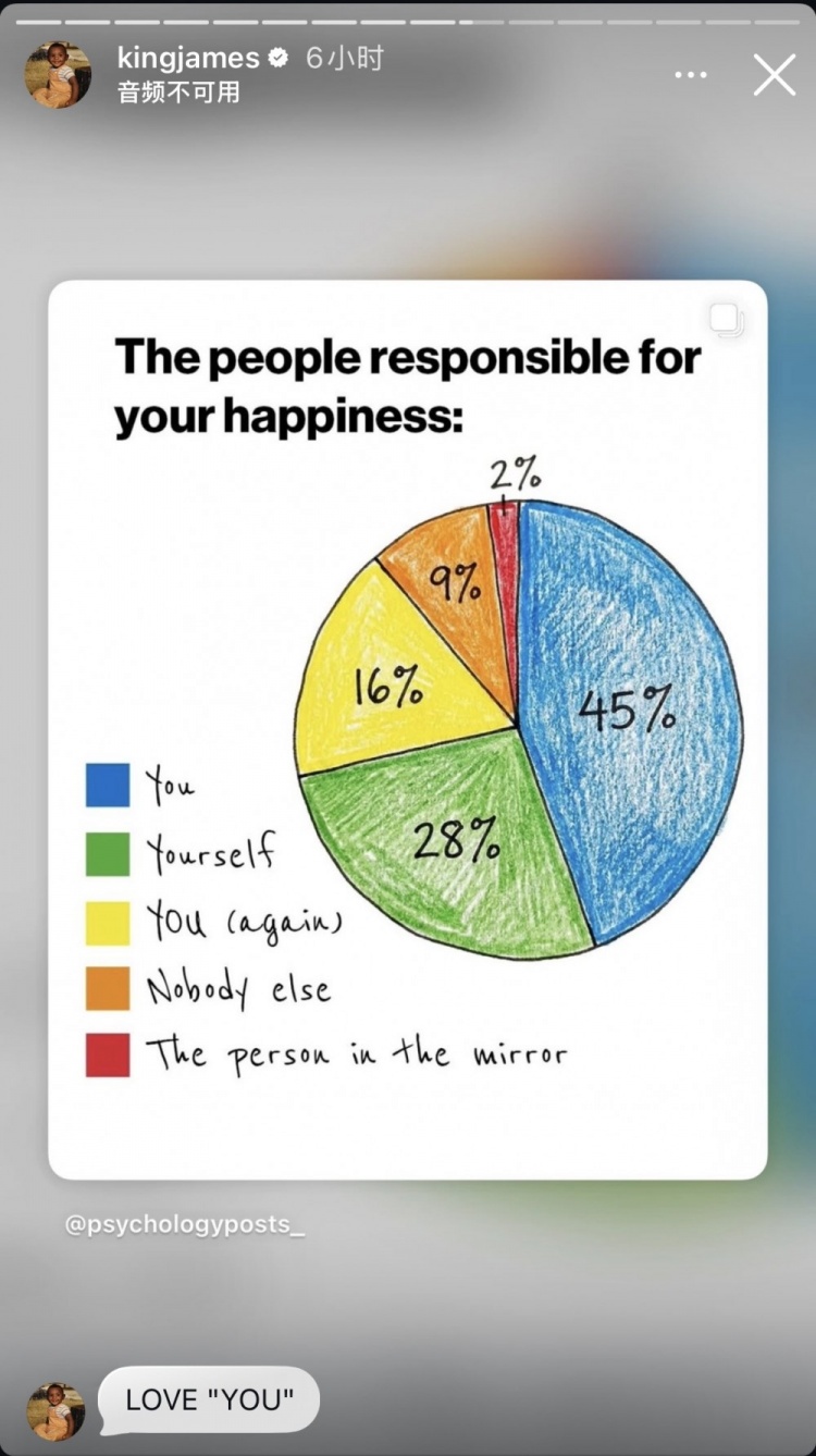 2月24日訊 今日,湖人球星詹姆斯更新了Instagram Story動態(tài)。詹姆斯轉發(fā)了兩段心靈雞湯。第一段為展示“你”是對自己的幸福影響最大的人的餅狀圖,詹姆斯評論道:“愛你自己?!?/p>第二段為一段格言:“當目標是體驗時,一切皆是勝利?!闭材匪乖u論道:“