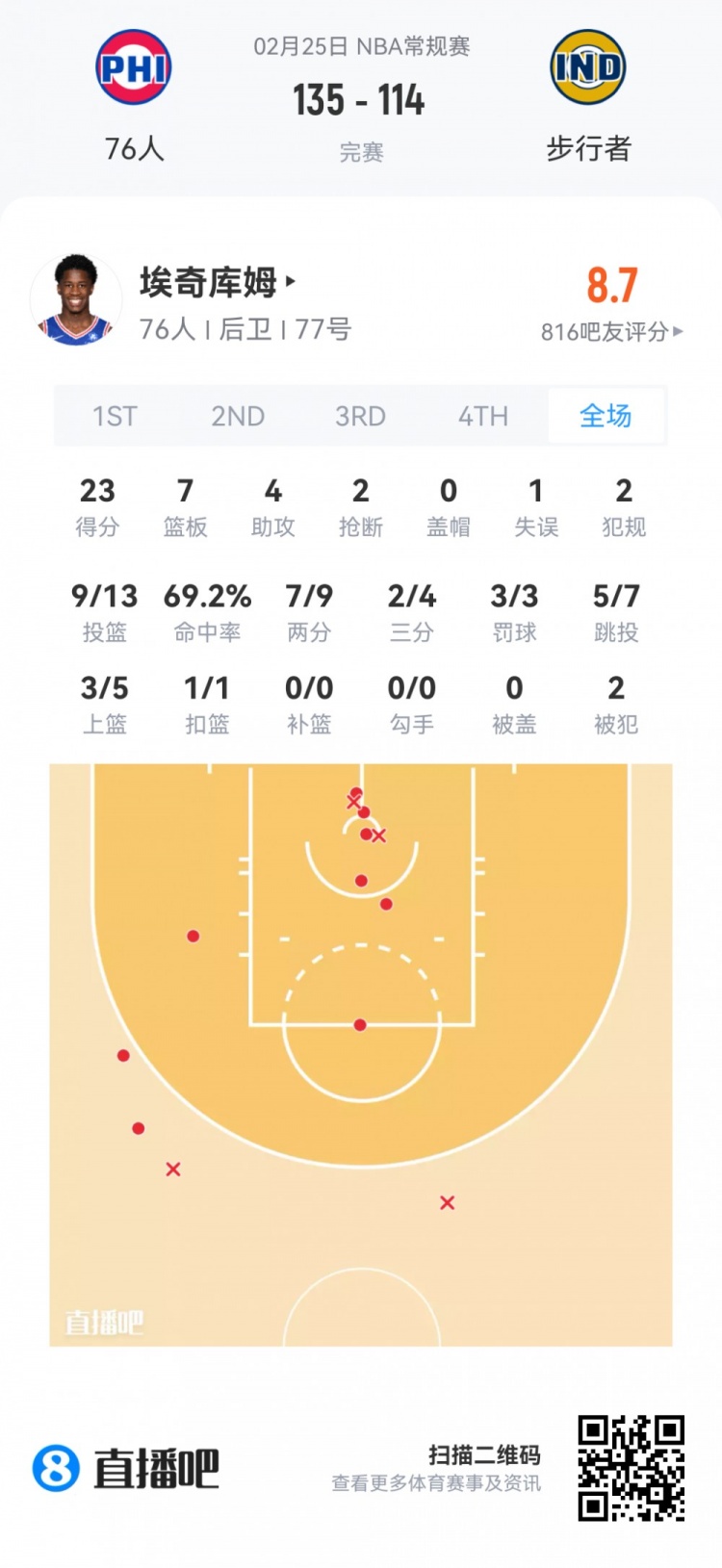 步行者次輪38號秀卡姆·瓊斯 登場29.4分鐘