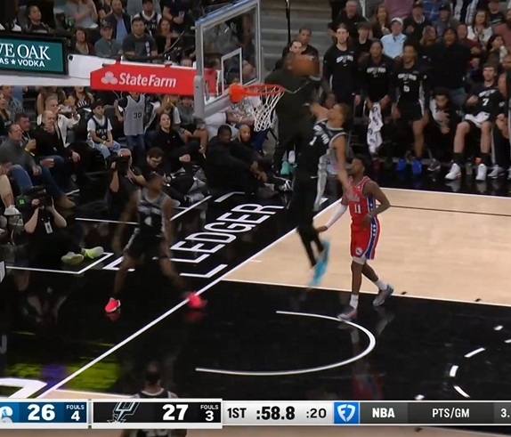 臉在籃筐上方!馬刺防守反擊 文班大步向前俯視籃筐單臂空接