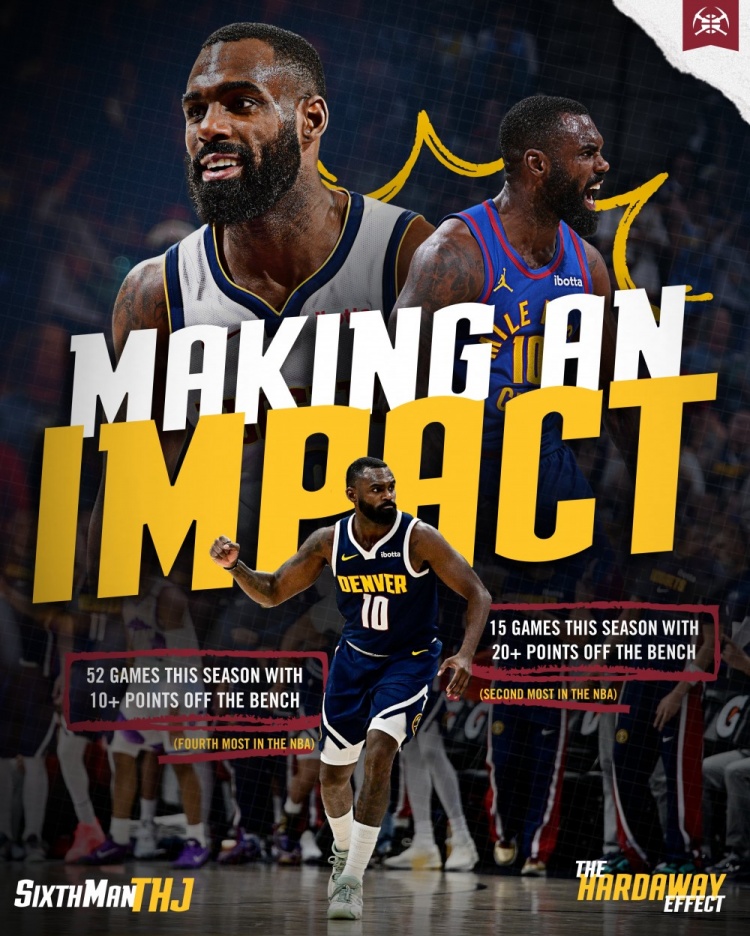 4月9日訊 NBA常規(guī)賽,掘金136-119戰(zhàn)勝灰熊。此役,哈達威出戰(zhàn)19分鐘,10中5,三分8中3,得到13分4籃板2助攻。賽后,掘金官方發(fā)布小哈達威數(shù)據(jù)海報:52場替補得分上雙聯(lián)盟第四;15場替補20+聯(lián)盟第二。本賽季小哈達威出戰(zhàn)79場,場均13.5分。