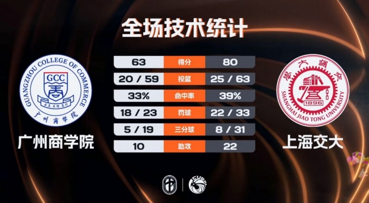 末節(jié)比賽,廣州商學(xué)院的命中率再次下滑,上海交大沒有再給他們?nèi)魏螜C(jī)會(huì),分差很快就拉開到兩位數(shù)并且直逼二十分,比賽徹底失去懸念,最終上海交大80-63輕取廣州商學(xué)院成功進(jìn)入半決賽。