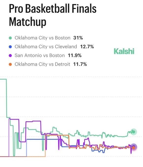 4月20日訊 預(yù)測(cè)平臺(tái)Kalshi曬出了本賽季總決賽對(duì)陣概率,具體如下:雷霆vs凱爾特人——31.0%雷霆vs騎士——12.7%馬刺vs凱爾特人——11.9%雷霆vs活塞——11.7%