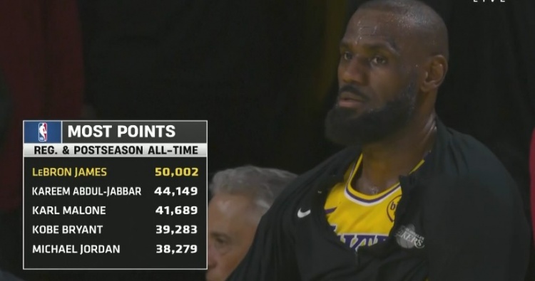 3月5日訊 NBA常規(guī)賽,湖人和鵜鶘的比賽正在進(jìn)行。截至發(fā)稿前,湖人球星詹姆斯已拿到3分,總得分來到50002分,繼續(xù)高居聯(lián)盟歷史第一。賈巴爾44149分排在第二,卡爾-馬龍41689分排在第三,科比和喬丹分別以39283分和38279分排在第四和第五位。