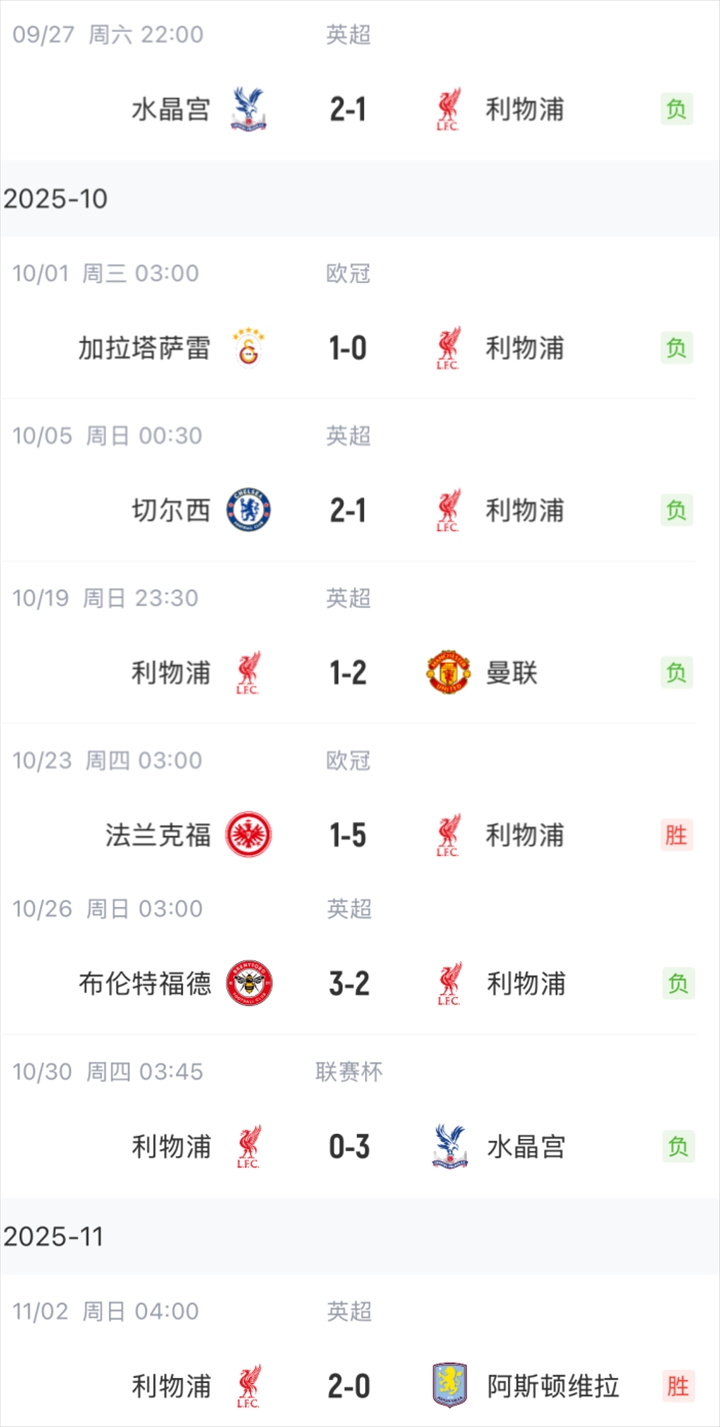 11月5日訊 本輪歐冠,利物浦主場1-0擊敗皇馬,除了賽果,利物浦在比賽過程中整體也拿出了良好的表現(xiàn)。此役后,利物浦各賽事取得兩連勝,球隊在此前聯(lián)賽擊敗維拉后,延續(xù)了取勝勢頭。在這兩場之前,利物浦的戰(zhàn)績一度來到各賽事7場僅1勝。此前戰(zhàn)績: