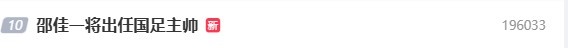 在媒體報(bào)道出邵佳一將出任國(guó)家隊(duì)主教練的消息后,“邵佳一將出任國(guó)足主帥”成了微博熱搜話題,一度排到熱搜第十位。