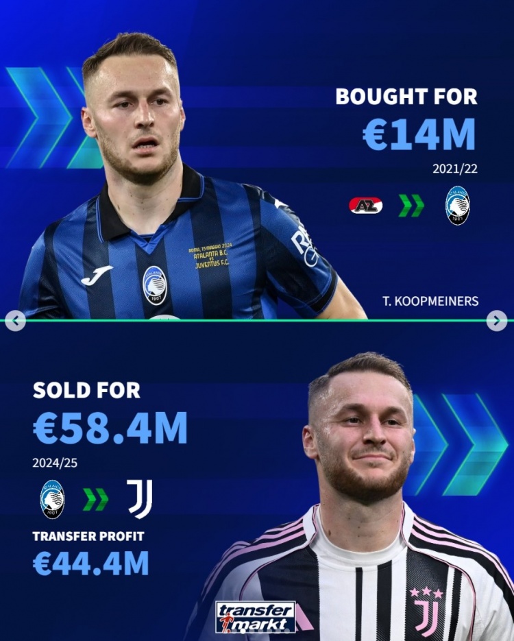 庫普梅納斯:1400萬從阿爾克馬爾引進(jìn),5840萬出售給尤文圖斯。盈利4440萬