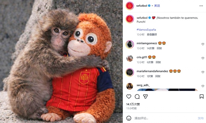 動(dòng)態(tài)的內(nèi)容是西班牙國(guó)家隊(duì)表達(dá)對(duì)小猴子Punch的關(guān)愛(ài):我們也愛(ài)你,Punch。小猴子Punch是出生在日本千葉縣的一家動(dòng)物園,因被母親遺棄,一直依賴一個(gè)紅毛猩猩毛絨玩具尋求安慰,這個(gè)故事在全球網(wǎng)絡(luò)上引發(fā)了廣泛的同情和關(guān)注。