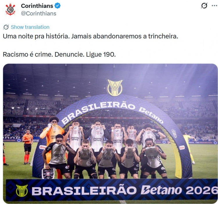 在本輪巴甲聯(lián)賽中,科林蒂安1-1戰(zhàn)平克魯塞羅,球隊(duì)在最后時(shí)刻扳平比分??屏值侔补偻婆湮膶?xiě)道:“足以載入歷史的一個(gè)夜晚,我們從不放棄。種族歧視是犯罪行為,如有請(qǐng)大家舉報(bào)?!?/p>