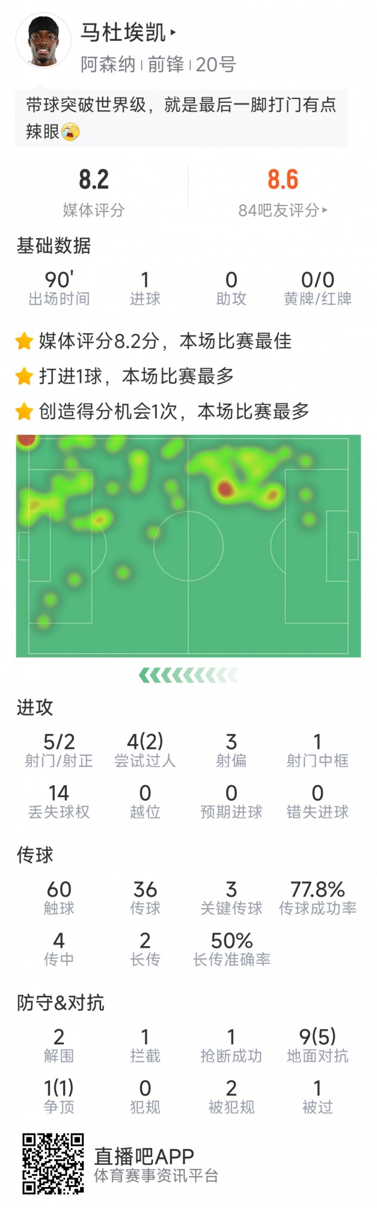 3月7日訊 在本輪足總杯,阿森納2-1擊敗曼斯菲爾德,以下為馬杜埃凱本場數(shù)據(jù):比賽時間90分鐘1粒進球5射2正4次過人2次成功1次中框60次觸球3次關(guān)鍵傳球傳球成功率78%2次解圍1次搶斷1次攔截10次對抗6次成功評分8.2分