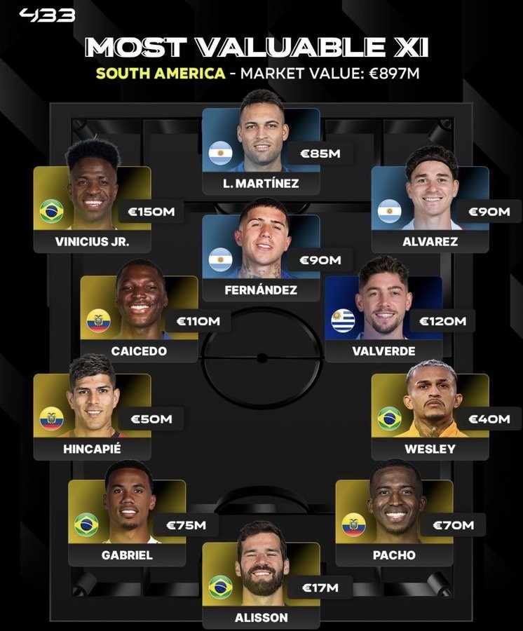 南美球員身價(jià)最貴陣:總身價(jià)8.97億歐元