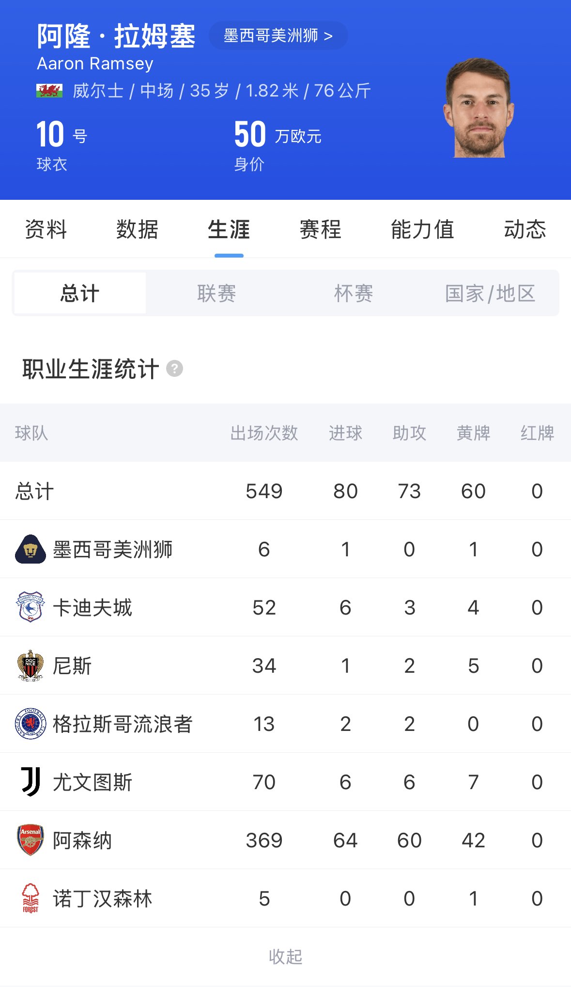 拉姆塞,場上司職中場,2007年他從卡迪夫城出道,2008年加盟阿森納,效力槍手11個賽季,拉姆塞為球隊出場369次,貢獻64球60助,奪得3次社區(qū)盾杯冠軍和3次足總杯冠軍。