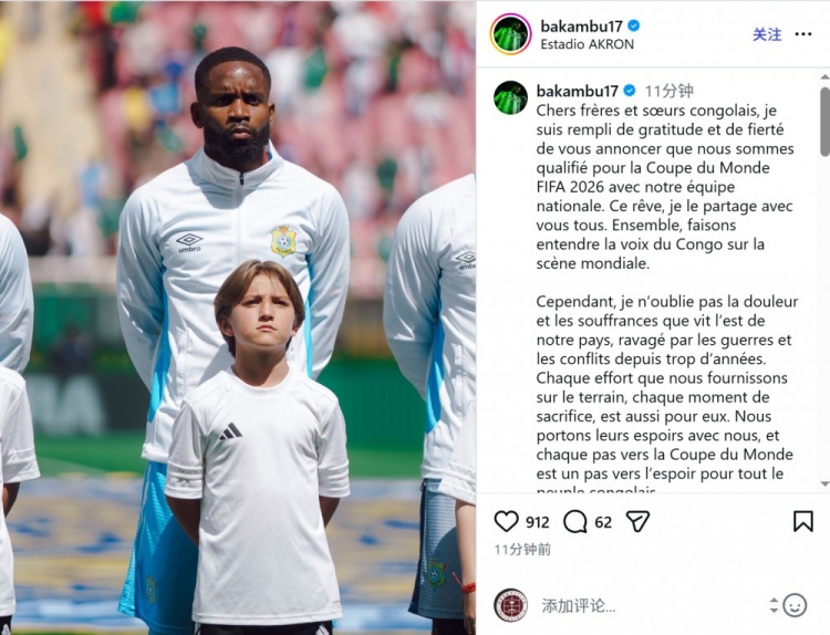巴坎布社媒曬出自己在國家隊的照片,并寫道:“親愛的剛果兄弟姐妹們,我懷著無比的感激與自豪向大家宣布——我們的國家隊已成功晉級2026年世界杯!這個夢想,我與你們所有人共同分享。讓我們攜手在世界舞臺上發(fā)出剛果的聲音。”