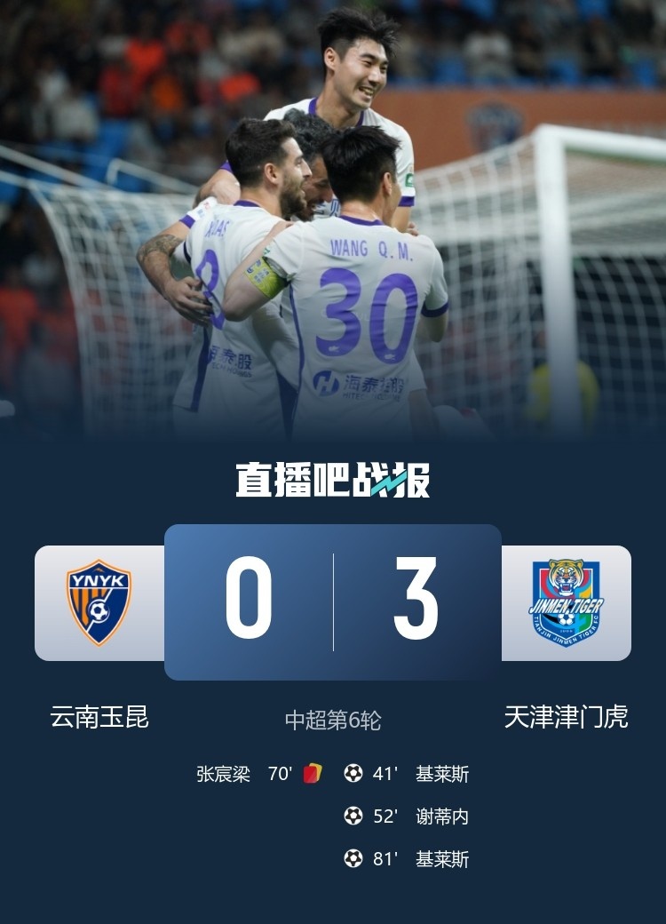 4月17日訊 中超第6輪,天津津門虎客場(chǎng)3-0擊敗云南玉昆,收獲賽季首勝。