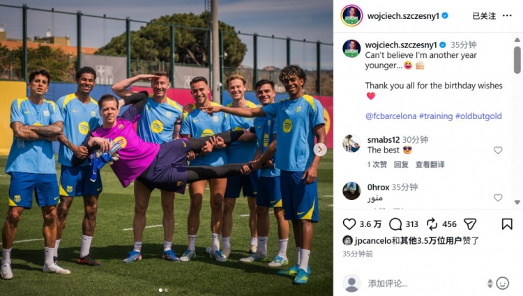 4月18日訊 巴薩門將什琴斯尼今日迎來36歲生日,球隊在訓(xùn)練場上也擺出造型為其慶祝生日。什琴斯尼在個人社媒也曬出與眾隊友的歡樂合照,配文調(diào)侃寫道:“真不敢相信我又年輕了一歲,感謝大家送上的生日祝福!”