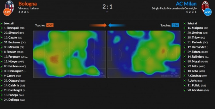 輸給博洛尼亞,米蘭的熱區(qū)表現(xiàn):中場(chǎng)根本沒有任何的控制力