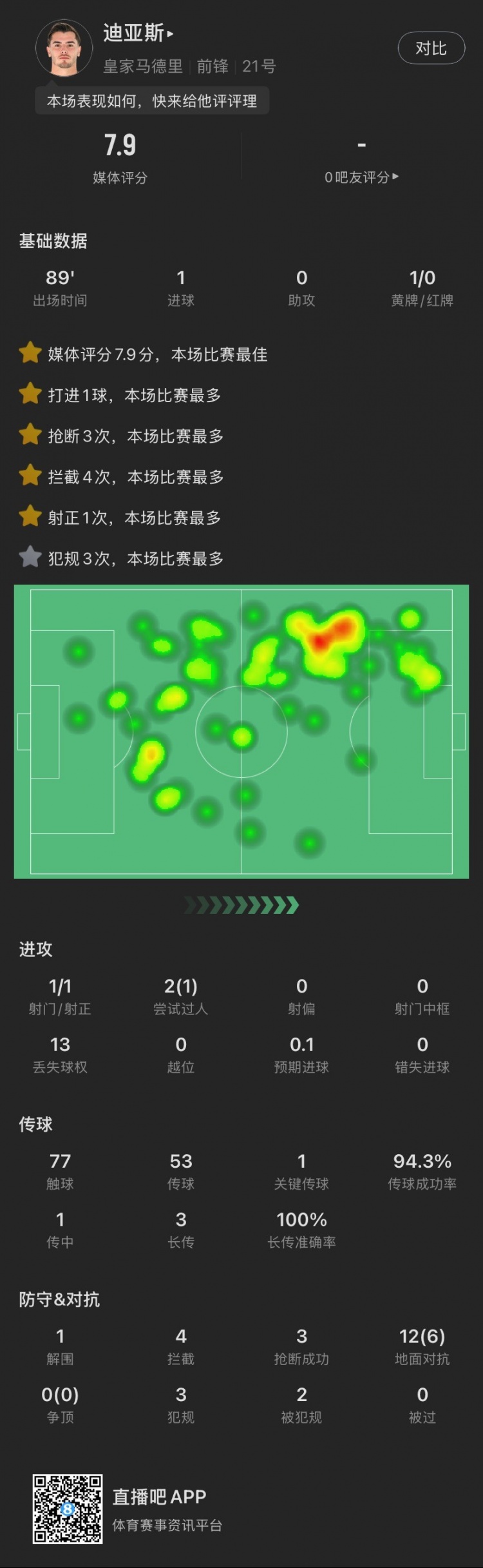 3月5日訊 歐冠1/8決賽首回合焦點戰(zhàn),皇馬主場2-1擊敗馬競。本場比賽,迪亞斯出場89分鐘打進1球,獲評7.9分全場最高。