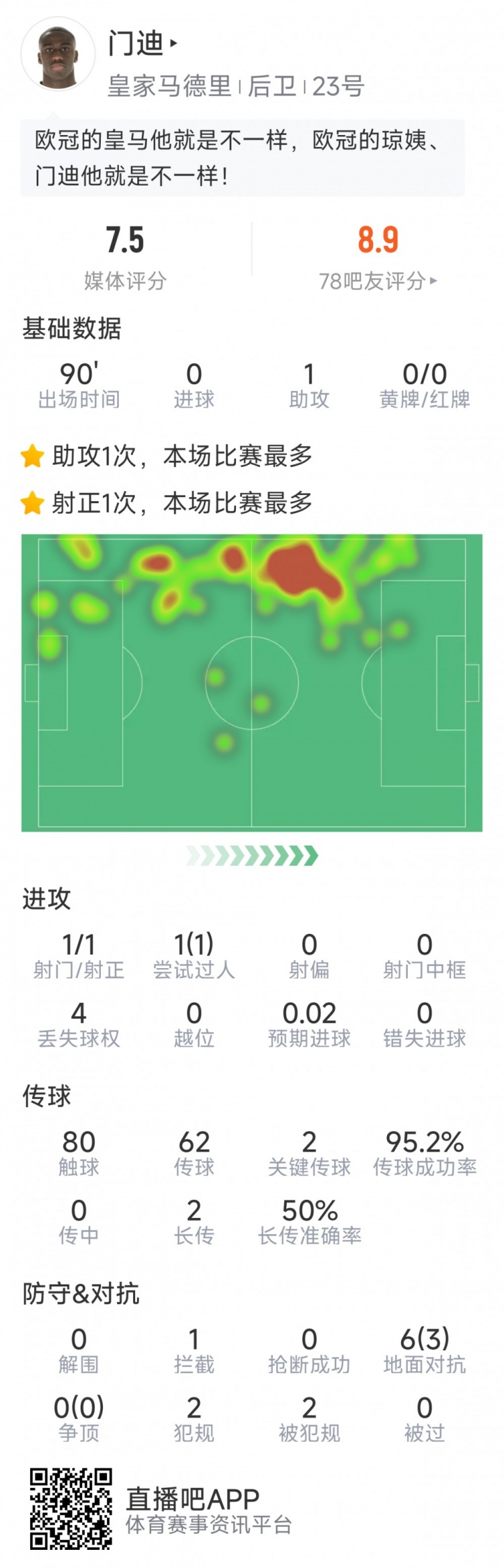 3月5日訊 在本輪歐冠皇馬2-1擊敗馬競的比賽中,門迪送出一次助攻,以下為他在本場數(shù)據(jù):比賽時間90分鐘1次助攻1次射門1次過人2次關(guān)鍵傳球80次觸球傳球成功率95.2%1次攔截6次對抗3次成功評分7.5分