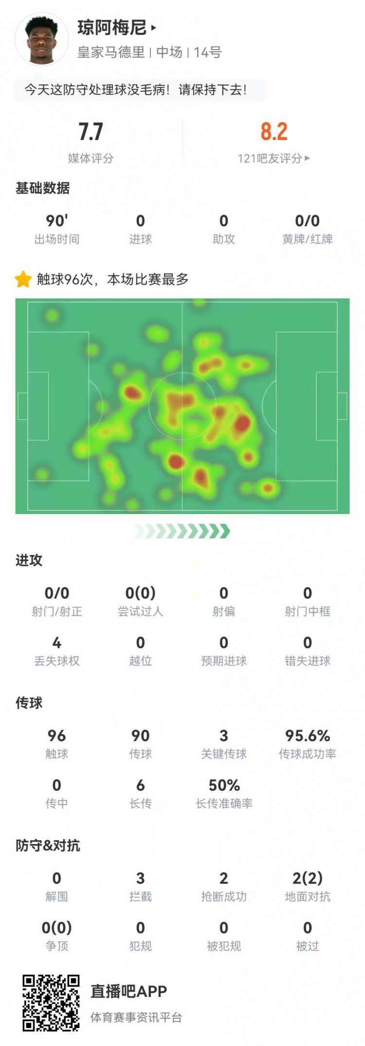 3月5日訊 皇馬在本輪歐冠2-1擊敗馬競,瓊阿梅尼本場數(shù)據(jù)如下:首發(fā)踢滿全場預(yù)期助攻0.2096觸球90傳球、86成功,成功率96%3關(guān)鍵傳球6長傳、3成功2對抗、2成功4丟失球權(quán)3攔截2搶斷0被過獲評7.7分