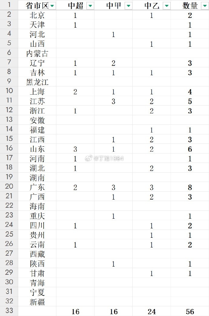 各級聯(lián)賽方面,山東省是中超聯(lián)賽球隊(duì)最多的省市區(qū)(3支)、廣東省則是中甲和中乙球隊(duì)最多的省市區(qū)(各3支)。