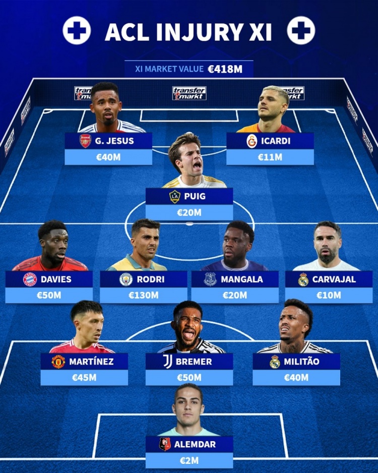 德轉排本賽季十字韌帶受傷陣容(總價4.18億歐):