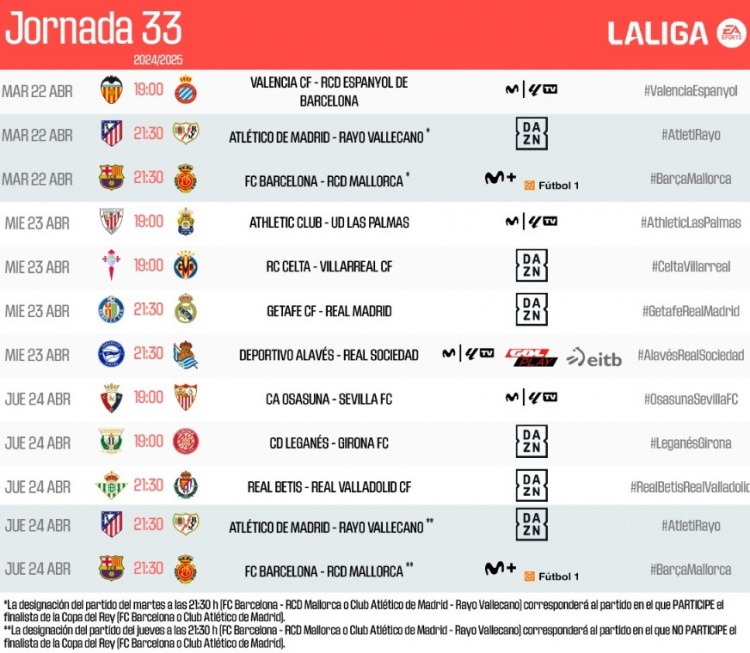 3月27日訊 西甲官方公布第33輪比賽時(shí)間,皇馬4月24日3:30出戰(zhàn)赫塔費(fèi),巴薩和馬競的比賽時(shí)間視國王杯半決賽結(jié)果而定。