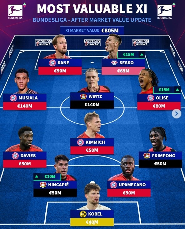 3月27日訊 德國轉會市場公布了德甲最貴陣,凱恩領銜的拜仁6將入選,維爾茨、塞斯科在列。