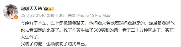 “啵啵天天醬”寫道:今晚打了個(gè)車,車上司機(jī)跟我聊天,他問我來黃龍看球嗎我說是的,然后跟我說他也去看國(guó)足的比賽了。找了個(gè)黃牛加了500買到的票,看了二十分鐘就走了。實(shí)在太生氣了。