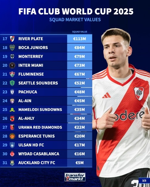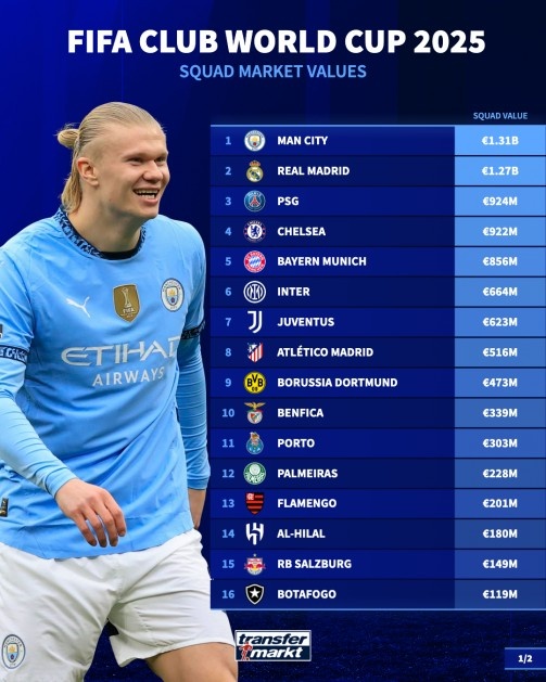 3月27日訊 德轉(zhuǎn)列已經(jīng)確定參加今年世俱杯的31隊身價排名,曼城、皇馬、巴黎排在前三,17支球隊總身價過億。