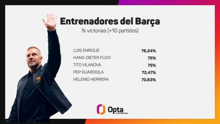 數(shù)據(jù)統(tǒng)計(jì)顯示,弗里克在巴薩各項(xiàng)賽事44場(chǎng)取得33勝,75%勝率追平比拉諾瓦。在隊(duì)史執(zhí)教超過(guò)10場(chǎng)的教練中,勝率僅次于恩里克(76.24%)。瓜迪奧拉勝率72.47%位列第四,埃倫尼奧-埃雷拉以70.63%勝率位列第五。