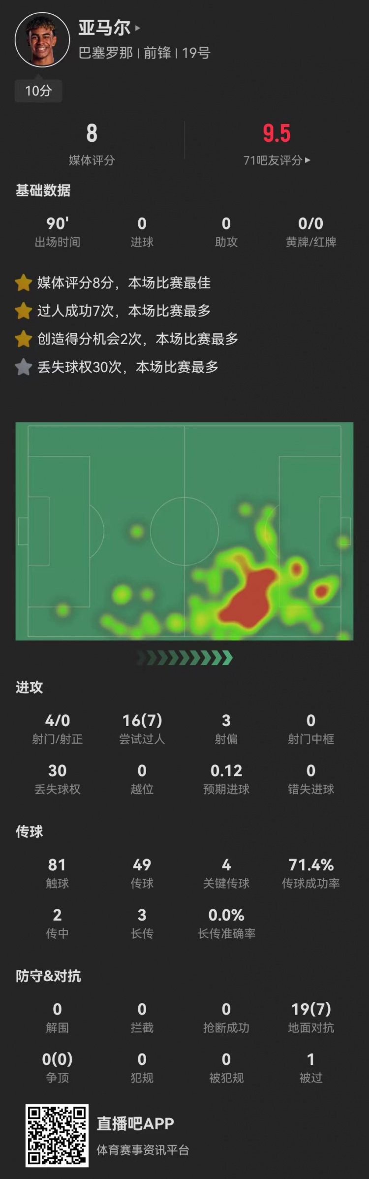 3月28日訊 巴薩在本輪西甲3-0完賽奧薩蘇納,亞馬爾本場(chǎng)數(shù)據(jù)如下: