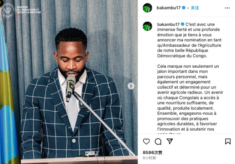 能夠被任命為民主剛果共和國農(nóng)業(yè)大使,我感到非常自豪和感動。對我個人而言,這是一個非常重要的里程碑,同時這也是對我們國家發(fā)展光明農(nóng)業(yè)的一個堅定承諾。希望未來,每一個民主剛果人都能自給自足,獲得高質(zhì)量的本地生產(chǎn)食物。